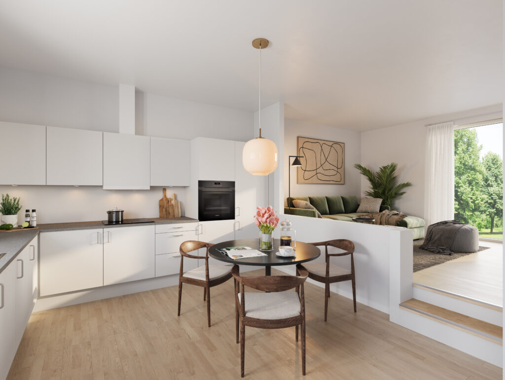 Rækkehusene rummer 4–5 værelser fordelt på 83–115 m². Her er plads til børneværelser, hjemmekontor og samvær i det store køkken-alrum med Svane-køkken og kvalitets-hvidevarer. Nogle boliger har et niveauspring mellem køkken og stue, der giver rummet ekstra luft og karakter.
